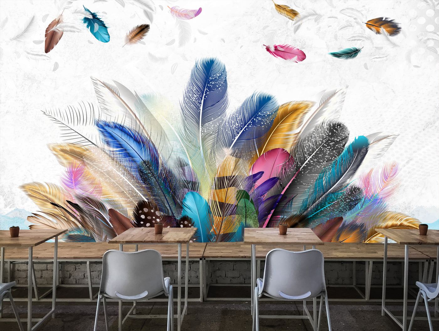 This beautiful wall mural showcases floating colorful feathers on a clean white textured background creating a light, airy, and elegant feel. The blend of blue, gold, pink, teal, and neutral tones adds a modern artistic touch while keeping the space calm and refreshing.